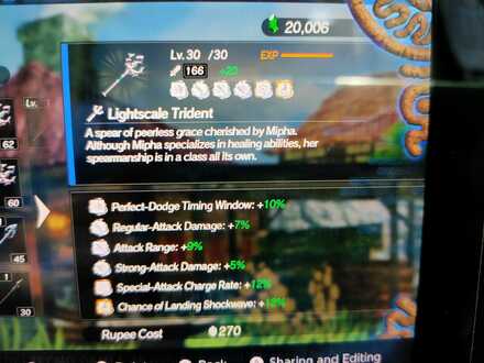 Mipha's hidden seals for the Lightscale Trident (lvl 30) are: Special-Attack Charge Rate++: +10% ~ 11% Chance of Landing Shockwave: (+10%) ~ 11% ~ 12% Both square shaped.