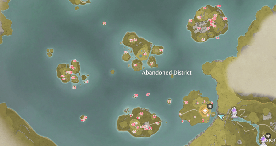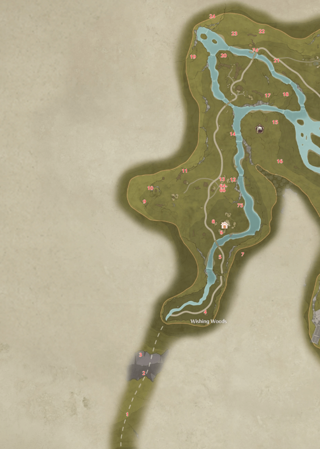 There are six (6) unique areas that will have Whimstars scattered in their vicinity for you to collect. The first four locations listed are immediately available, while the last two are locked behind story progression: