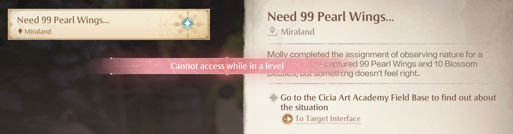 Hi, I am having difficulty with this quest because I am currently at the part were i need to investigate at the Art Academy. However, when i click "To Target Interface" to track the quest, it pops up "Cannot access while in level". But i go to Pepsa anyway and talk to her, and she says nothing about Molly or the situation.