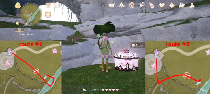 missing chest: in "Florawish"; nearest warp spire is "Secret Base". after warp: route #1: head southeast towards the little area between 2 waterfalls, and enter the area behind the waterfall. walk onto the yellowish-green pipe and keep walking forward until you fall off. the chest should be there. route #2: head south to where a small path seems to disappear into the mountains, and follow the path inside. go up the stairs and fall onto the left path, then turn around. the chest should be there.