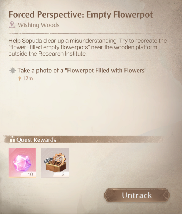 there's a forced perspective quest in the wishing woods called Forced Perspective: Empty Flowerpot