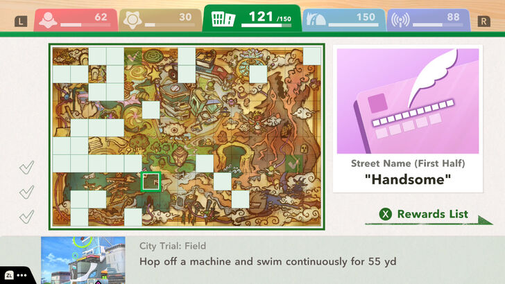 the reward for challenge 111 for City Trial: Field, aka... Hop off a machine and swim continuously for 55 yd... is not correct... its actually the word / street name "Handsome"