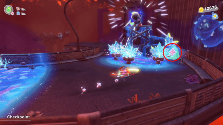 Total: 10 Starries ・Clear the stage (3) ・Save the hidden Starries (4) ・Light 5 lanterns in the wastes (1) ・Clear the timed platforming sequence on top of the ship on your first try (1) ・Defeat all enemies with Sign Mouth (1) |
