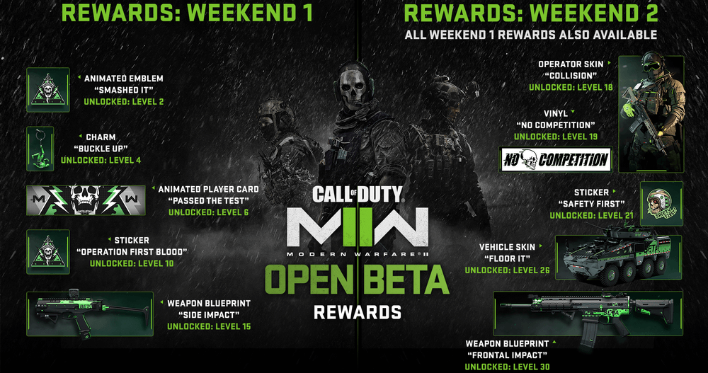 Rewards in the open beta were unlocked by earning EXP and leveling up an Operator. All rewards players earned during the beta will be available to claim on launch day (Oct. 27, 2022) and later in November for Warzone 2.0.
