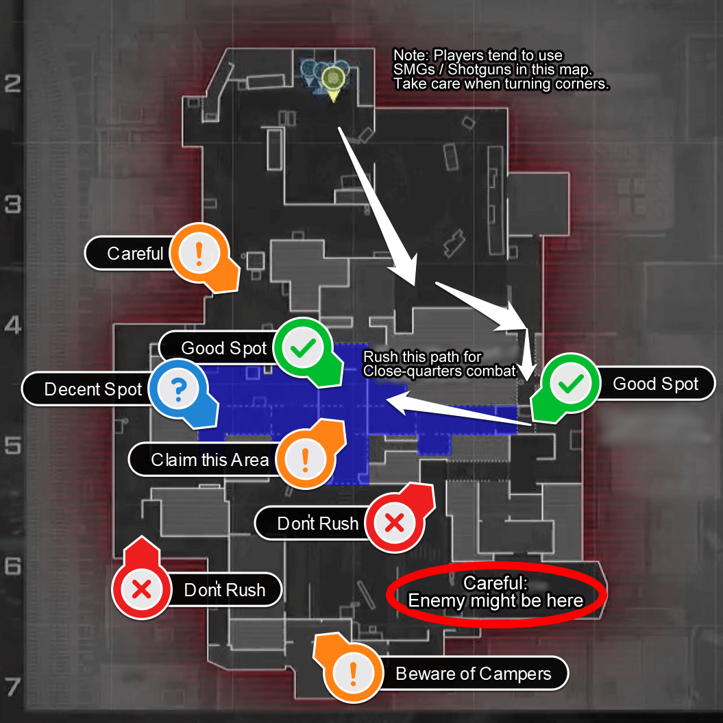 It's generally advised to try to claim the central area, since it has a good view of either side of the map. Avoid areas with campers and stick to areas with lots of cover and corners.