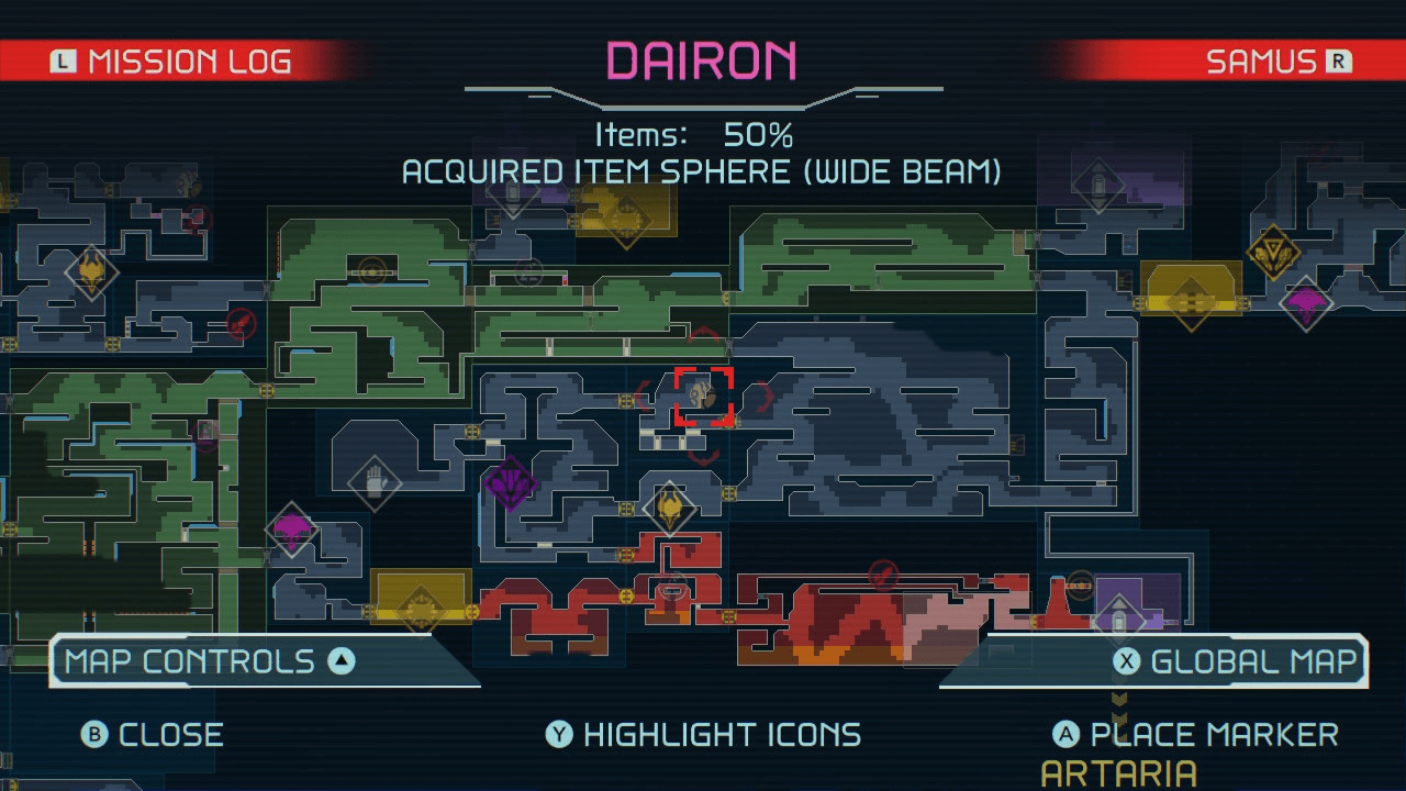 Activate the generator located in the central area of Dairon to power up all the doors and stations. Once everything is powered up, travel right until you find a Missile Door. Open up the door to enter the WIde Beam item sphere room.