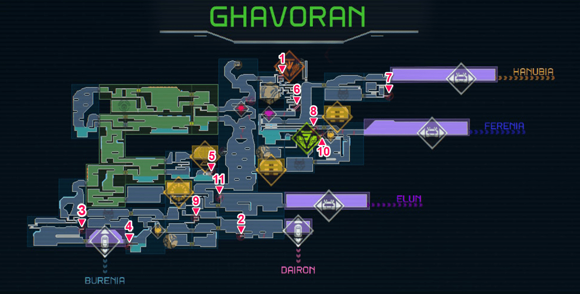 The shuttle to Burenia is located near the southwest part of the map. Samus first arrives in this area on her first visit to Ghavoran to obtain the Super Missile upgrade.