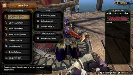 Hi, anon! You can put decorations in higher-level slots, so you can slot in a Lv. 2 decoration like the Tenderizer Jewel 2 in the Lv. 3 slot of the Nephilim Tassets.