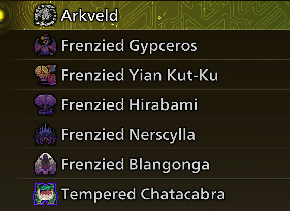 Turns out all monsters that can appear in the Iceshard Cliffs can become Frenzied. (Not including Aberrant Arkveld and Jin Dahaad.)