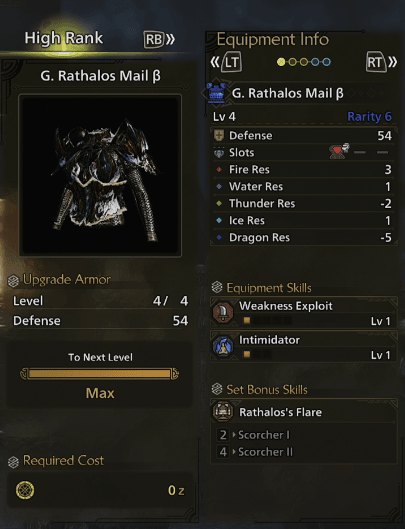 G. Rathalos Mail βG. Rathalos Mail β Mighty Jewel【2】 Icon ー ー Weakness Exploit Lv. 1 Intimidator Lv. 1 Wrong stats for this item