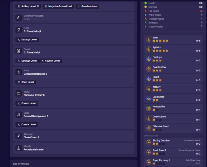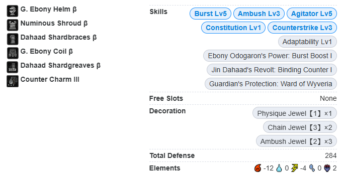 My build is ebony helmet and Braces and the rest is Zoh Shia armor with burst talisman. You can use jewells to max skills that you need/want and gives you additional 1 lvl coalescence and 1 lvl elemental absorption. Plus it has more defence (407 total If I remember it right)
