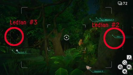 The third Ledian is on the left just past the 2nd Ledian, it's hanging on the wall just before the tree (above the 2 Morelull). If you play the music as you pass the 2nd Ledian you'll be able to see the 3rd one waking up as the music ends. Also, don't forget to hit them with an orb after they wake up. I forgot that part several times lol