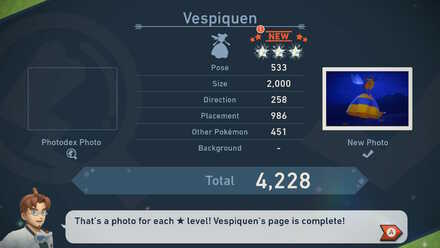 Can confirm that level 1 research level is the way to go! I did so many runs of r2 that yielded nothing. My first r1 run trying to get this photo was a success! My 3-Star photos were all from behind, while Vespiquen was giving orders tk the Combee, just after arriving after lighting the first flower!