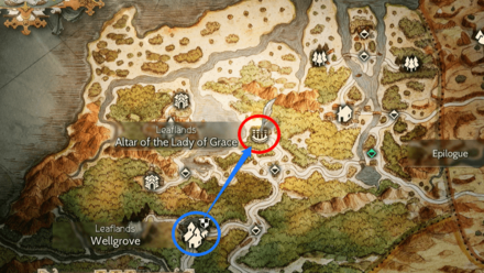 The fastest way to the Altar of the Lady of Grace where you'll acquire Agnea's EX Skill Windy Refrain is to fast travel to Wellgrove in Leaflands, exit to Eastern Wellgrove Trail, head north to the Northern Wellgrove Trail, and take the path heading north until you see a wooden signpost. On the right should be a tree with a hidden cave near it.