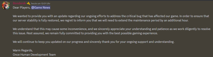 Dear Players We wanted to provide you with an update regarding our ongoing efforts to address the critical bug that has affected our game. In order to ensure that our server stability is fully restored, we regret to inform you that we will need to extend the maintenance period by an additional hour. We understand that this may cause some inconvenience, and we sincerely appreciate your understanding and patience as we work diligently to resolve this issue. Rest assured, we remain f
