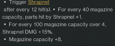 this info is incorrect. the gun has been changed. theres no limit of 4 shrapnel parts. and shrapnel damage is increased by 15% for ever 100 rounds over 4.
