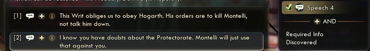 Wrong info in guide, the option "I know you have doubts about the protectorate. Montelli will just use that against you" requires 4 Speech, maybe because the guide was made on Casual rather than normal or above