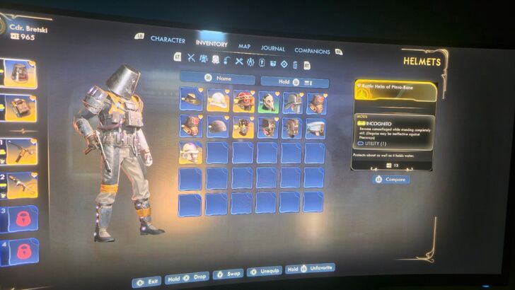 You are missing a unique helmet, called Battle Helm of Ptero-Bane. Its basically a bucket that makes you invisible but you can only see through 2 eye holes. Mods are Incognito- Become camouflaged while standing completely still? (Disguise may be ineffective against Pterorays) and 1 utility slot. Its found on a scarecrow outside Fairfield