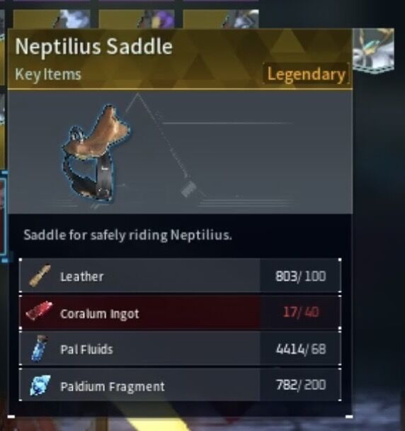 Leather x 100 Coralum Ingot x 40 Pal Fluids x 68 Paldium Fragment x 200 This is the updated/current recipe for a Neptilius Saddle