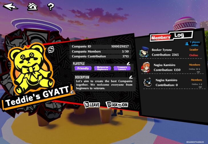 ID: 100025287 No one wants that, trust me. We’re just a bunch of Phantom Thieves vibing, grinding, and cracking dumb jokes while we take down bosses. If you like chill squads with style, grab your mask and hop in.