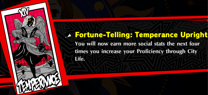Temperance Upright You will now earn more social stats the next four times you increase your Proficiency through City Life. Additional 6 proficiency points to activities that increase proficiency.