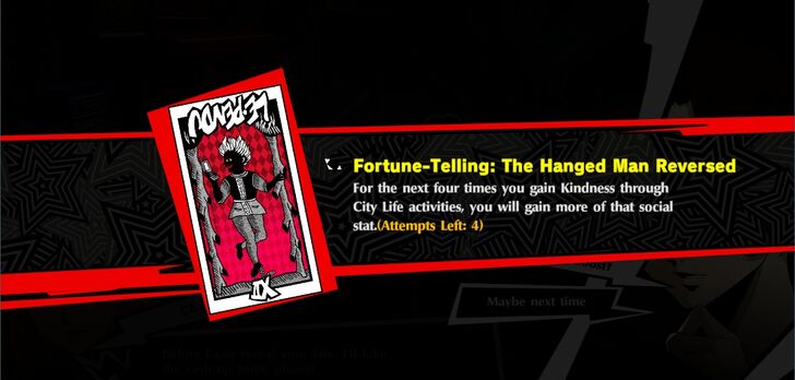 The Hanged Man Reversed For the next four times you gain Kindness through City Life activities, you will gain more of that social stat.