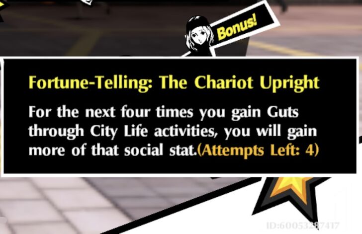 The Chariot Upright: For the next four times you gain Gits through City Life Activities, you will gain more of that social stat.