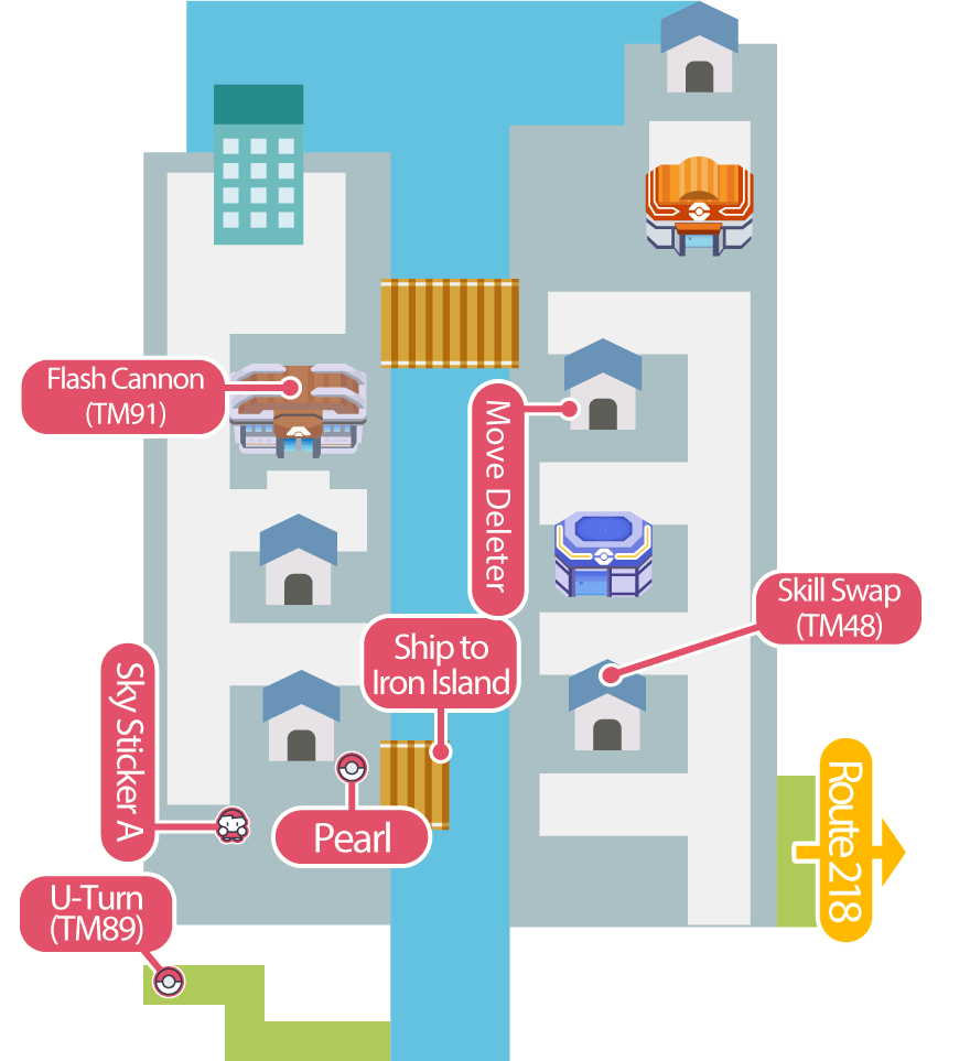 This is a map and walkthrough for Canalave City in Pokemon Brilliant Diamond and Shining Pearl (BDSP). Learn what Pokemon are found on Canalave City, and what trainers, items, and events are encountered here.