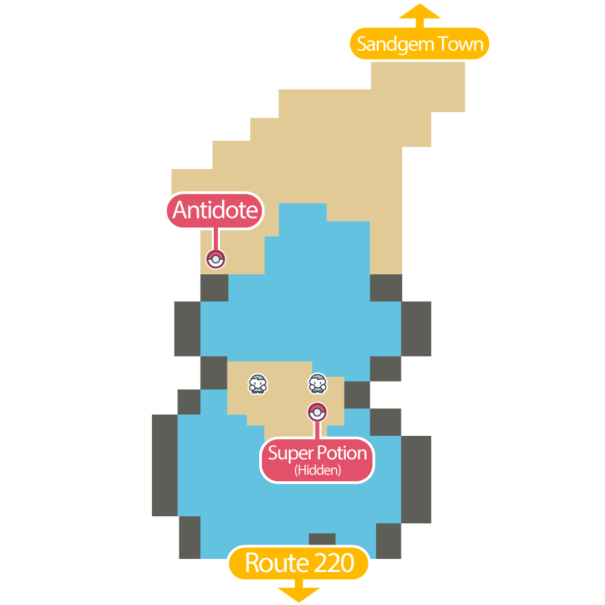 On first visit via Sandgem Town, Route 219 may seem like it cuts off at the beach, but you'll be able to traverse the water later on after getting the Surf Hidden Move.