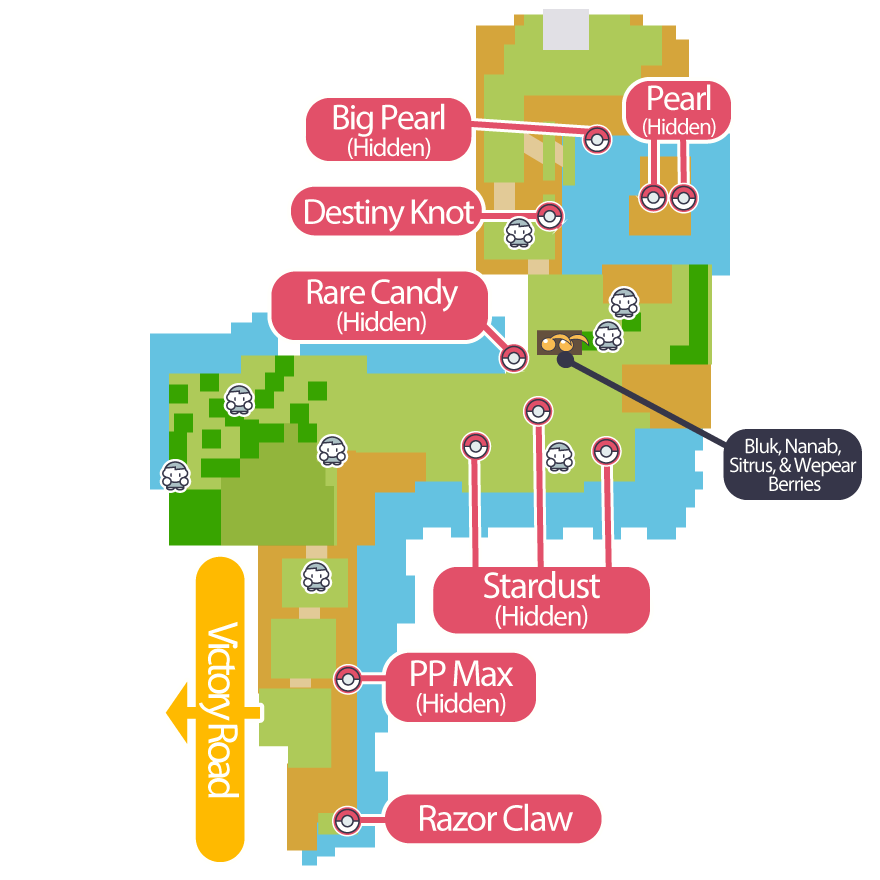 | 1 | From the Pokemon League, head down the waterfall and go back inside Victory Road. |