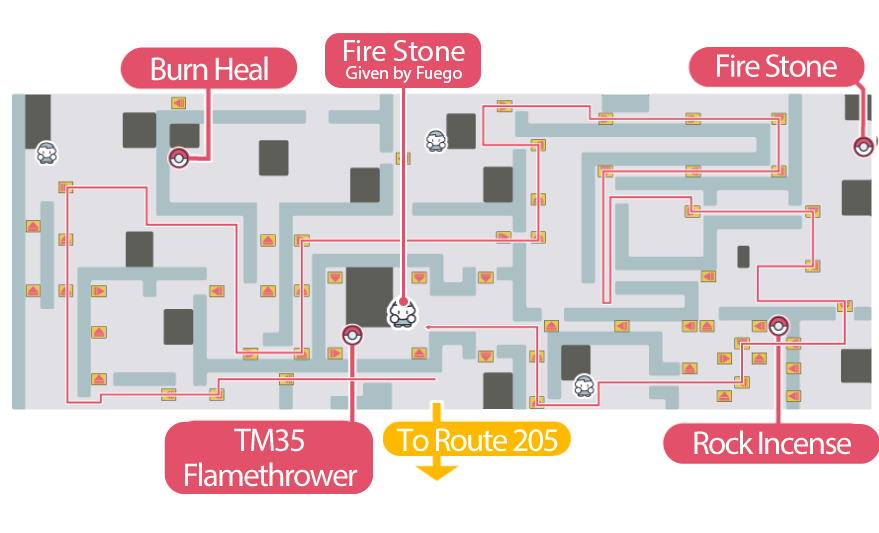 You can get two Fire Stones and a TM35 Flamethrower in Fuego Ironworks. One Fire Stone is at the norhteastern area of the place and the other one will be given by Mr. Fuego himself when you reach the center. Don't forget to grab the TM35 Flamethrower near him.