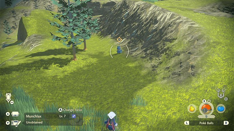 Use the Heights Camp as a starting point and head to the cliffsides southwest of Deertrack Path at Obsidian Fieldlands. You can find a Munchlax roaming around next to a tree.