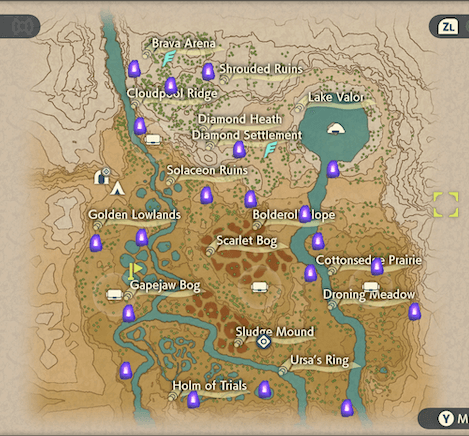 | Jubilife Village | Obsidian Fieldlands | Crimson Mirelands |