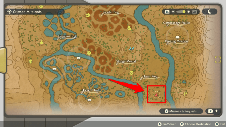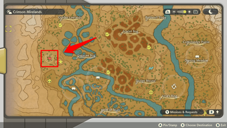 Fast travel to Mirelands Camp and head south to Gapejaw Bog. If you don't have a Hisuian Braviary, Sneasler, or Basculegion you'll have to cross a few wooden bridges to get there.