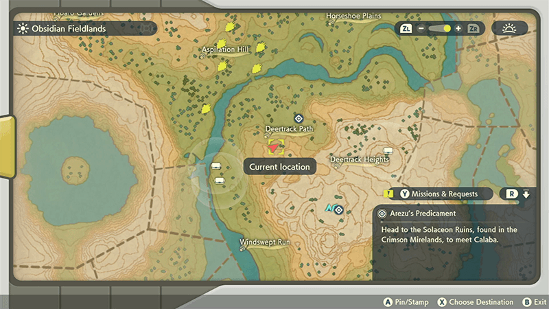 | 1 | ![]() At Obsidian Fieldlands, head to the cliffsides of Deertrack Path northwest of the Heights Camp. Munchlax can be found in the area marked on the above image. |