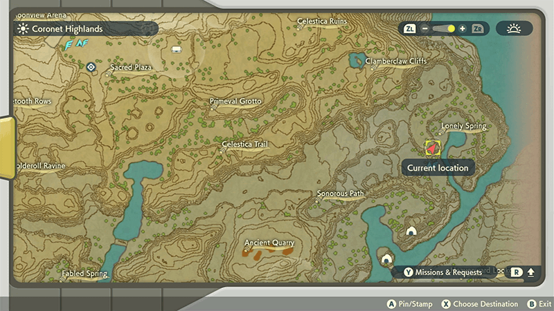 | 1 | View Full Image At Coronet Highlands, use Sneasler or Braviary to head up the hill north of the second Base Camp. You can dig up the Old Verse 8 on the area marked with "Current Location" in the image above. |