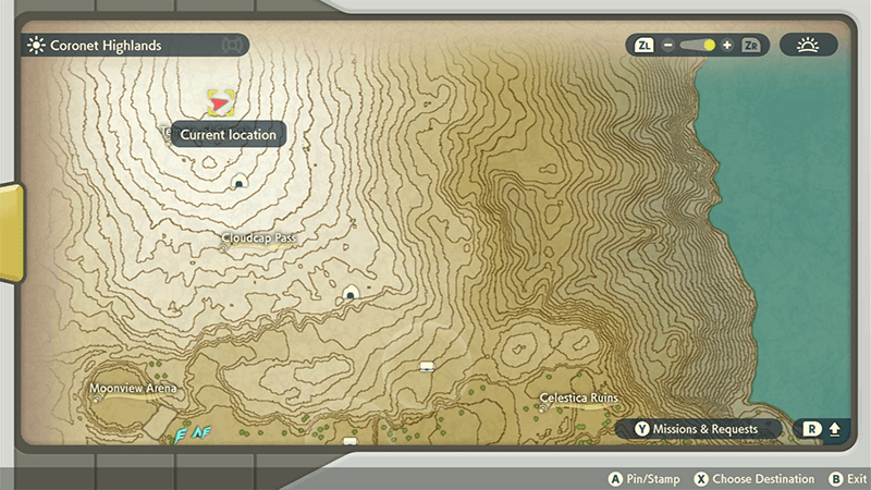 | 1 | ![]() At Coronet Highlands, head to Mount Coronet's peak to enter the Temple of Sinnoh. You can dig up the Old Verse 11 on the area marked with "Current Location" in the image above. Note that you can access this area after completing The Counterpart Mission. |