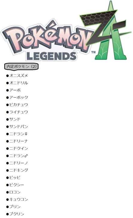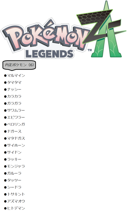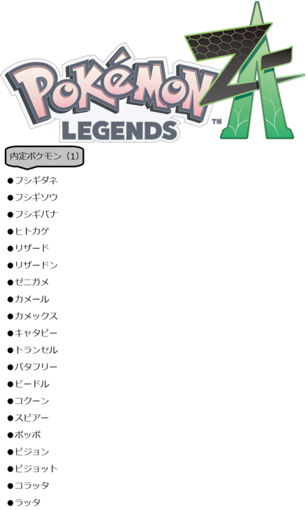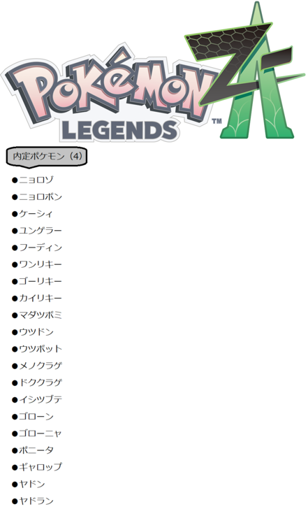 == 『Pokémon LEGENDS Z-A』【ポケモン】 == 内定ポケモン(34)
