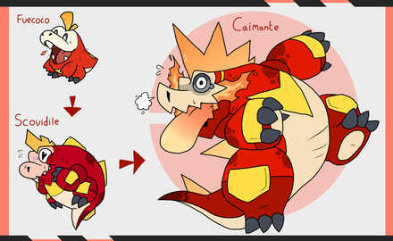 Fuecoco is kind of cool and cute, plus its a crocodile or an alligator...idk so imma choose Fuecoco here's a pretty nice idea of Fuecoco's evolution line I've found