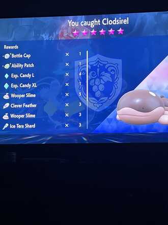 GUARANTEED ABILITY PATCH & BOTTLE CAP (if you win) 6-Star Tera Raid Ice Tera Clodsire (Going to be on a break, last one for now. Resuming in 1 hour.) F1N5YL