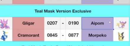Looking for Gligar/Gliscor in pokeball and Cramorant in pokeball Willing to trade Aipom/Ambipom and Morpeku or other violet exclusives