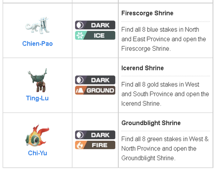 Just a small error: You got three of their location mixed up Chien-Pao -Icerend Shrine Ting-Lu -Groundblight Shrine Chi-Yu -Firescorge Shrine