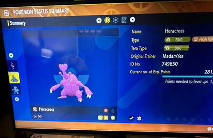 Shiny Pink Heracross that I have caught and only shiny that has appeared after playing over 999 hours of Scarlet. It doesn’t matter what I do with my version that I preordered and bought digitally with violet from Nintendo Switch Store months before release. I also haven’t received one sweet Herba Mystica the entire game. My version stinks!!!