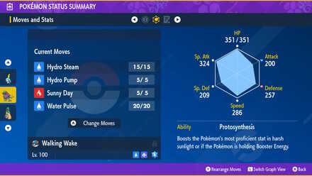 Hey I’m a Pokémon player if you didn’t already guess, and I used Walking Wake to help me beat hisuian typhlosion, it’s move are: sunny day, to activate his ability. Hydro Steam, because it’s boosted in the sunlight. Hydro pump for plain damage and lastly he has water pulse just in case I need to confuse the typhlosion. His terra type is water and has no items equipped, if you can find an item that fits it’ll work, my order of moves is usually sunny day, hydro steam and we repeat hydro steam