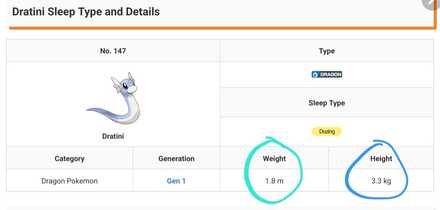 So... I noticed that in Pokémon page entries for Pokémon Sleep - and so far, it looks like it's there for ALL of them - the labels and/or data fields for "height" and "weight" are switched. 😅