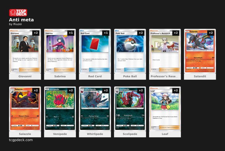 L8TWBKMC this Is my frosmoth-greninja deck. Pretty solid against everyone. The basic strategy Is try to set up damage while opponent's Pokémons are asleep. Meowth helps with searching cards. It's a very control deck, and easy to build.