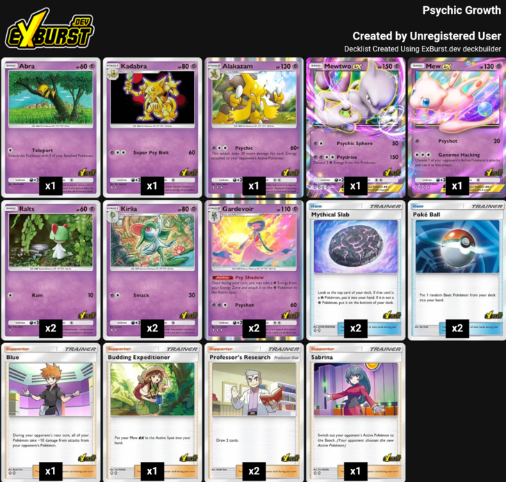6B0RHUJB Varíant of Garde - MewMewtwo (added Alakazam) Focus on Evo Garde. Trainer tip: Pokeball -> Oak -> Psychic Stone (try use after the others searchers ) Explorer help to recicle Mew Try to keep 1 energy in Mew/Alakazam (2 Mewtwo) to make quick charge to then with Gardevoir Blue vs mirrors Mewtwo (140 dmg keeping 10 hp left) ID You wants to be more agressive, change ir for Giovanny (worth to counter Blue)