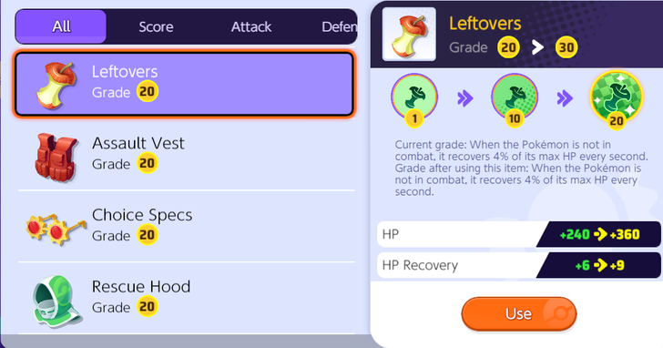 Maxed Leftover gives 360 HP & 9 HP/s now. But the Update still says it gives 240 HP & 9 HP/s. It 4% HP/s out of combat. Which is helpful to . Because of the 5 second cooldown many players are using it to recover health by hiding in grass. New update made health recovery much easier as in 20 seconds 60% Health will recover by itself. Yes it might not be the best Held Item but it is useful now than before.