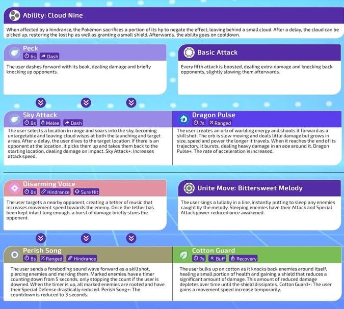 Altaria would be an excellent pokemon in the all rounder category, however, due to it being a flying type, Altaria would be weak against rock type, electric types, and ice types, also, Altaria is a popular pokemon many fans love, although it may be considered exp on the sky ruins map, we'd LOVE to see Altaria be a playable character with its own stats, pros and cons!
