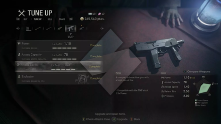 TMP Power: Level 3: 0.80 (20,000 ptas) Level 4: 0.95 (38,000 ptas) Level 5: 1.10 (56,000 ptas) Ammo: Level 4: 60 (24,000 ptas) Level 5: 70 (36,000 ptas) Reload: Level 4: 1.30 (10,000 ptas) Level 5: 1.40 (11,000 ptas)